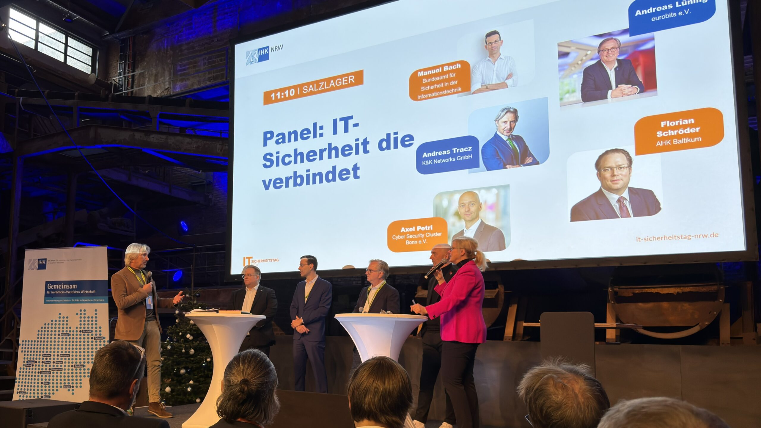 Der IT-Sicherheitstag NRW am 03.12.2025 war erneut ein voller Erfolg und bot kleinen und mittleren Unternehmen praxisnahe Orientierung, konkrete Unterstützung sowie vielfältige Möglichkeiten zur Vernetzung. Über 500 Teilnehmerinnen und Teilnehmer kamen in der Kokerei Hansa in Dortmund zusammen, um sich über aktuelle Risiken, Lösungen und Entwicklungen im Bereich IT-Sicherheit auszutauschen. Schirmfrau der Veranstaltung war Mona Neubaur, stellvertretende Ministerpräsidentin des Landes Nordrhein-Westfalen. Besonders geprägt wurde der diesjährige IT-Sicherheitstag durch die Anbindung des German-Baltic Digital Summit, wodurch die internationale Perspektive auf Cybersecurity noch stärker in den Mittelpunkt rückte.